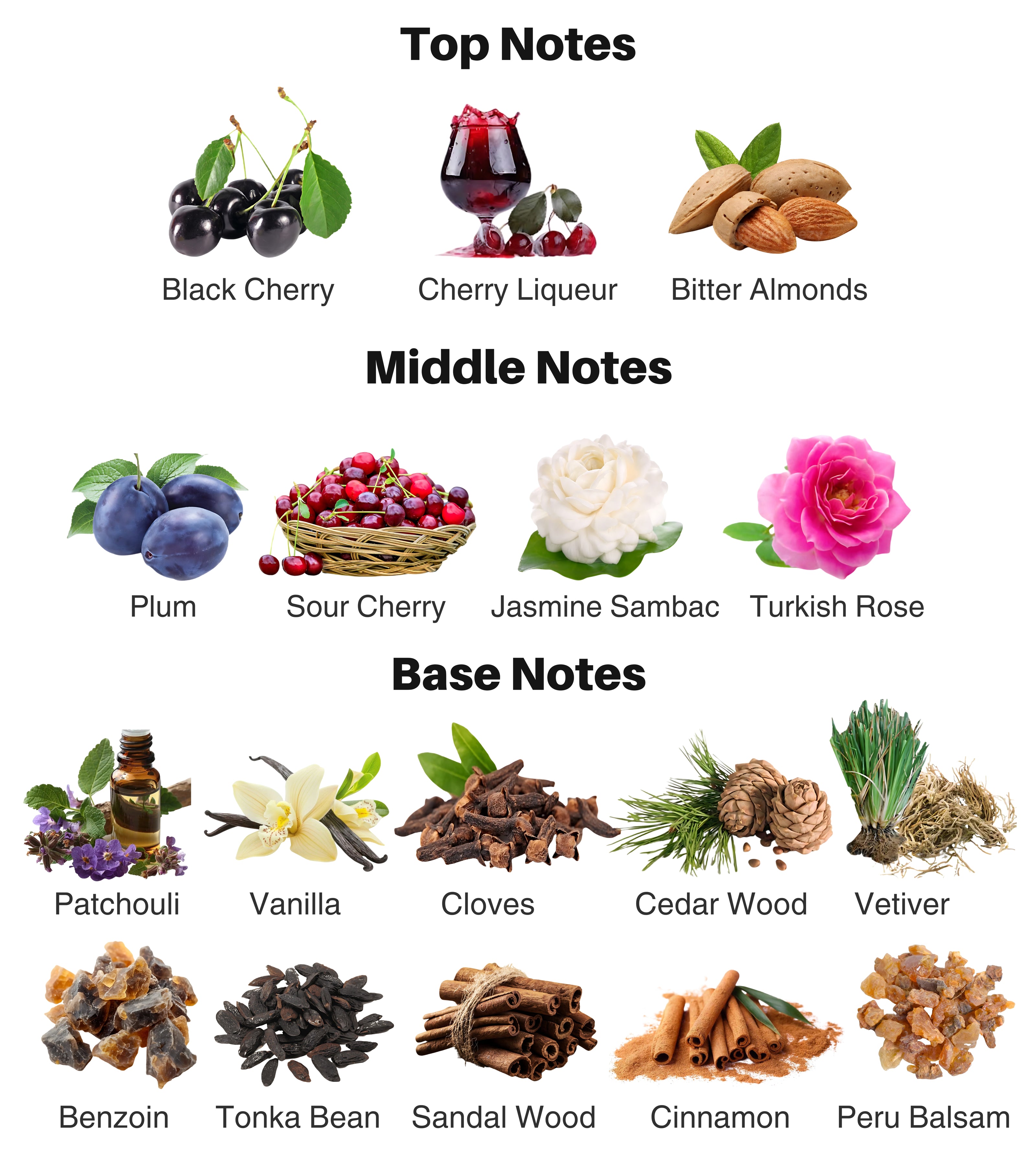 Cherry Sauvage is a bold and seductive fragrance for women, blending luscious cherry, creamy almond, and smoky woods. It opens with a vibrant burst of black cherry and bitter almond, setting a deep and indulgent tone. At the heart, Turkish rose and jasmine add elegance and floral refinement. The base is rich and warm, featuring tonka bean, vanilla, balsam, and smoky woods—leaving behind a captivating, addictive trail.